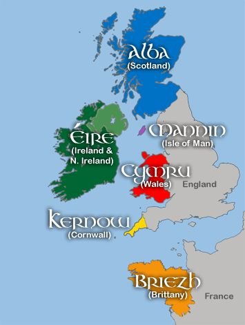 Sada pogledajmo gdje se nalaze keltski narodi i koji kriteriji određuju njihovo uključivanje u takozvanih "Šest keltskih naroda". Moderni keltski narodi uključuju šest područja, smještenih prvenstveno u Ujedinjenom Kraljevstvu: Škotska, Wales, Cornwall, Ostrvo Man i Sjeverna Irska (dio Irske), kao i područja izvan Ujedinjenog Kraljevstva: Republika Irska i Bretanja (Francuska) (Fotografija 2).